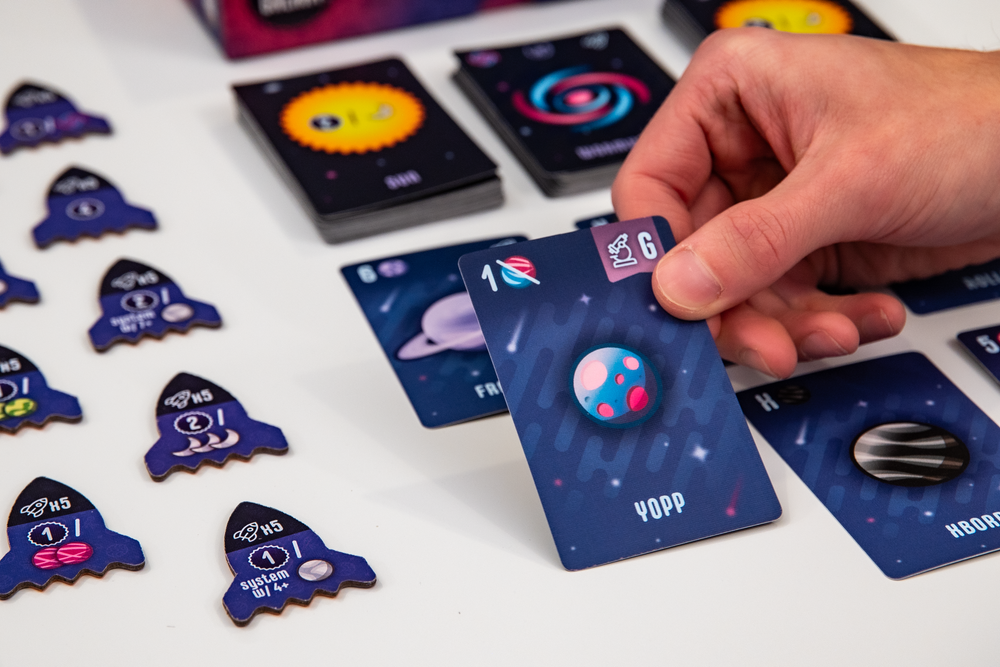 The cards you collect get added to stacks called solar systems. Solar systems consist of planets, suns, moons, asteroids, and wormholes. Each of the different card types has its own requirements or scoring opportunities, and it takes a game or two to properly wrap your head around them. Sun cards, for instance, give each solar system scoring opportunities based on things like matching pairs of coloured planet cards, a bit like the point cards in Point Salad. Moon cards can score points, as long as they’re next to, or between, certain types of planets. Asteroids don’t do much on their own, but during final scoring, there are big points on offer for the players with the most of them.